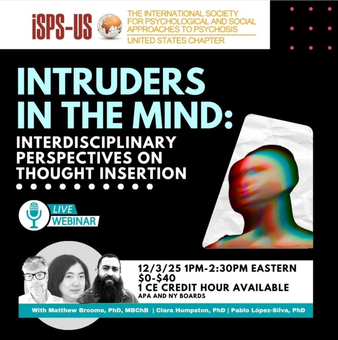 El Dr. Pablo López-Silva participará como co-presentador en el Webinar Internacional “Intruders in the Mind: Interdisciplinary Perspectives on Thought Insertion”, organizado por ISPS-US